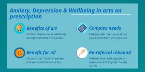 Infographic results about Arts on Prescription from the newest University of Gloucestershire research based on Artlift data. Look at those improvement results!